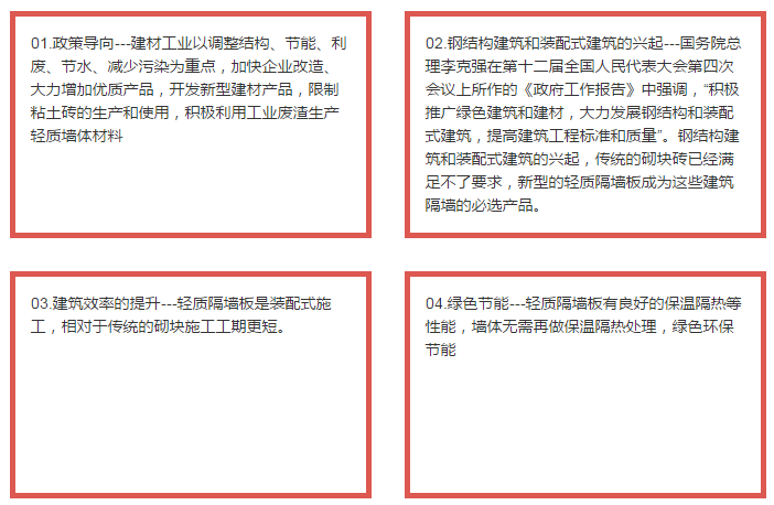 按照國家十三五規(guī)劃,至2020年,我國裝配式建筑要占全部建筑中的比重不低于30%,那么,在未來五年,新型裝配式墻體材料及相關產(chǎn)品將有幾十倍的增長。《國家"九五"計劃與2010年國家經(jīng)濟發(fā)展鋼要》再次強調(diào)"建材工業(yè)以調(diào)整結構、節(jié)能、利廢、節(jié)水、減少污染為重點,加快企業(yè)改造、大力增加優(yōu)質(zhì)產(chǎn)品,開發(fā)新型建材產(chǎn)品,限制粘土磚的生產(chǎn)和使用,積極利用工業(yè)廢渣生產(chǎn)輕質(zhì)墻體材料"。