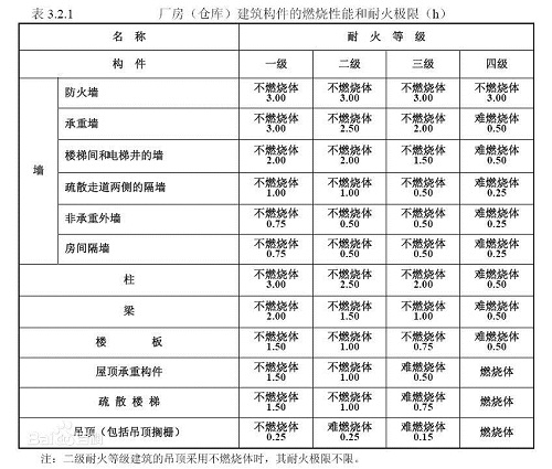在標準耐火試驗條件下,建筑構(gòu)件、配件或結(jié)構(gòu)從受到火的作用時起,到失去穩(wěn)定性、完整性或隔熱性時止的這段時間,用小時表示。建筑構(gòu)件的耐火極限要求見下表