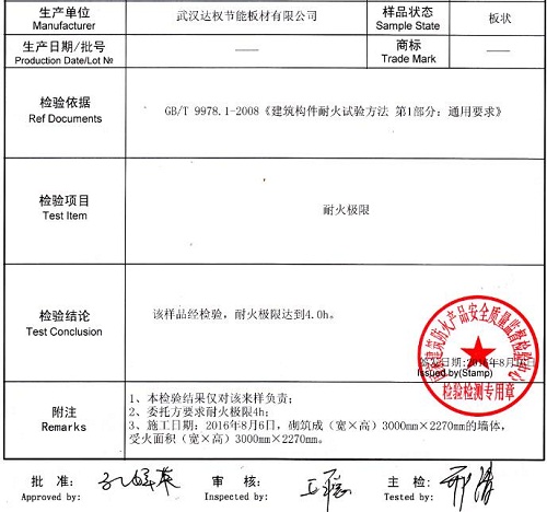 從表中可以看出,最高的耐火要求是3小時,那達權(quán)輕質(zhì)隔墻板的耐火極限可以達到多少,先給大家展示一下達權(quán)輕質(zhì)隔墻板的耐火極限檢測報告。