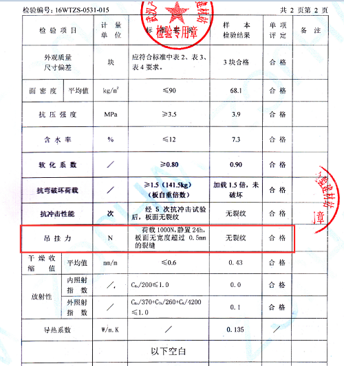 達(dá)權(quán)DQ墻板是以硅酸鈣板作為面板,以水泥、EPS泡沫顆粒、黃沙等一次性復(fù)合形成的,因芯材中有水泥、黃沙等材料,所以DQ墻板的牢固性是有保證的,而且達(dá)權(quán)輕質(zhì)隔墻板成功的在多個項目中應(yīng)用,經(jīng)受了市場的考驗,吊掛力方面更是有保證的,同時,達(dá)權(quán)輕質(zhì)隔墻板都是經(jīng)過專業(yè)機構(gòu)的檢測的,下面給大家展示一下90mm復(fù)合夾芯板的吊掛力方面的檢測報告: