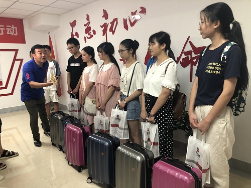 (為學生們送上拉桿箱以及企業(yè)紀念品)