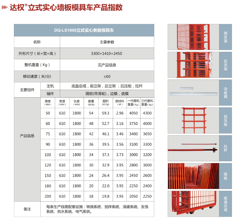 組成:底盤總成,前立架,后立架,后壓板,拉桿,隔板(帶滑輪),邊模,底模。