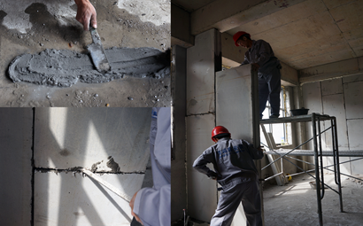 用電動(dòng)工具攪拌粘合劑,按配方均勻拌合,干濕適中,粘合劑要隨配隨用,并應(yīng)在30min內(nèi)用完。墻板與地面,與其他墻、柱接觸處涂抹粘合劑,由二人將墻體按墻體線扶正就位,一人拿撬棒,就位后,由一人在一側(cè)推擠,準(zhǔn)確對(duì)線,一人用撬棒將墻板撬起,邊撬邊擠,并通過(guò)撬棒的移動(dòng),使墻板移在線內(nèi),是粘合劑均勻填充接縫,使凹凸楔口連接緊密,互相咬合,楔口內(nèi)粘合劑飽滿(以擠出漿為宜)。