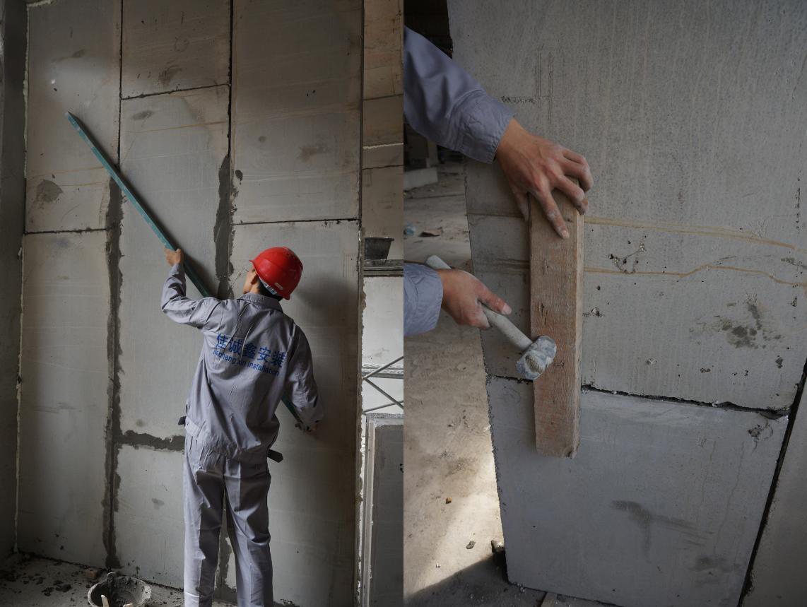 調(diào)校時(shí)一人手拿靠尺緊靠墻板面測(cè)垂直度、平整度,另一手拿鐵錘擊打膠楔。調(diào)整墻板頂部不平處:一人拿靠尺,另一人拿木方靠在墻板上,用鐵錘在木方上輕輕敲打校正(嚴(yán)禁用鐵錘直接擊打墻板)。重復(fù)檢查平整度、垂直度,直至達(dá)到要求為止(檢查垂直度時(shí)鋁合金靠尺上吊掛線錘),校正后用刮刀將擠出的膠漿刮平補(bǔ)齊,依次安裝。
